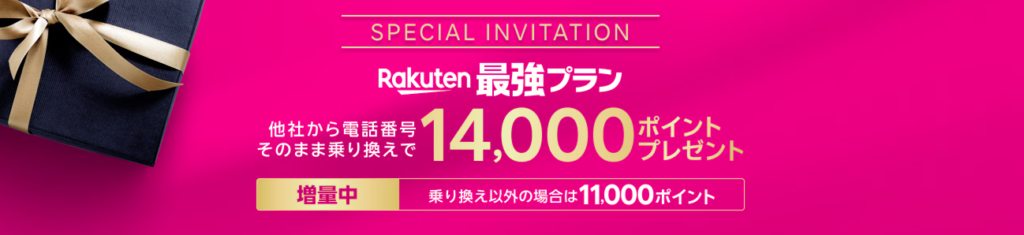 月額3,280円の無制限通信とプラスエリアモード無料・そして今なら申し込み時はMNP 14,000 P / 新規 11,000 Pがもらえて、楽天モバイルならではの特典まで利用できるようになるのはこの方法の魅力的なところです。