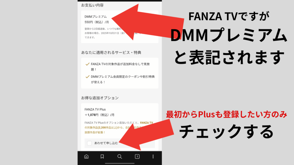 すぐにFANZA TV Plusも追加したい場合は「あわせて申し込む」にチェックを入れましょう。