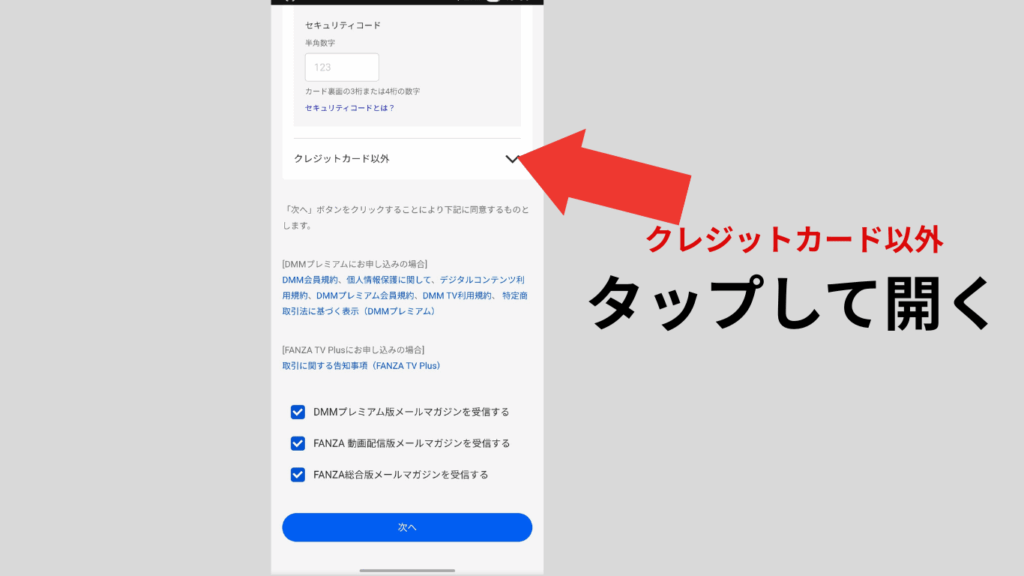 クレジットカード情報の入力箇所の下にある【クレジットカード以外】を開きます。