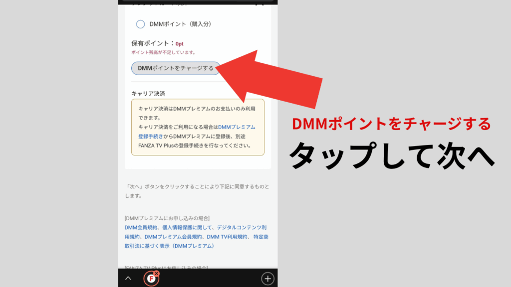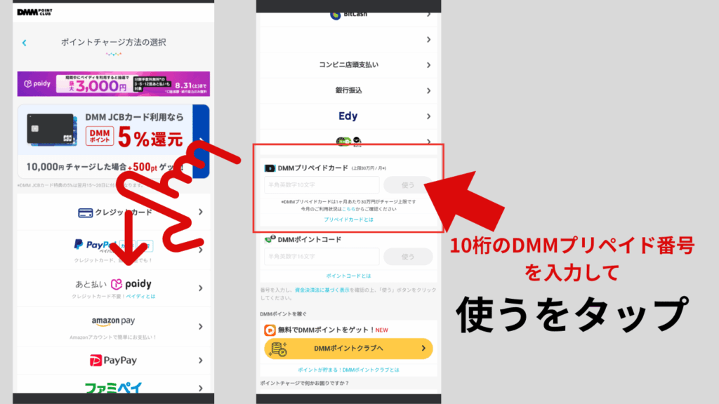 ここも少し分かりづらいです。ポイントチャージ方法のページで、下にスクロールしていくと【DMMプリペイドカード】の項目があります。入力して右側の【使う】をタップします。