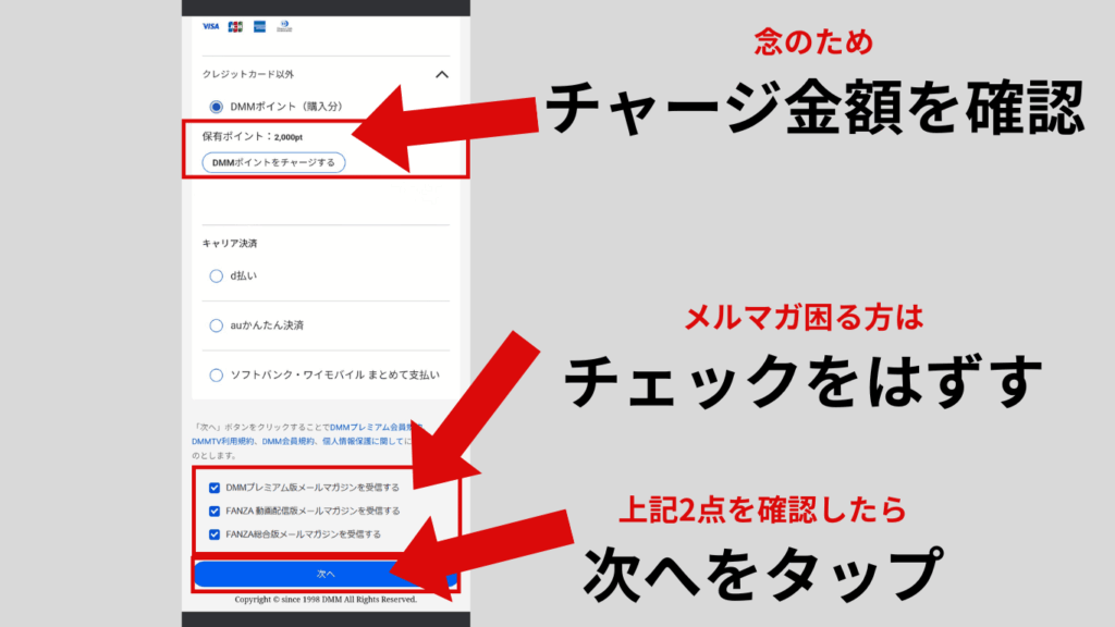 チャージ金額とメルマガ受信の可否を確認をしてから【次へ】を選択します。