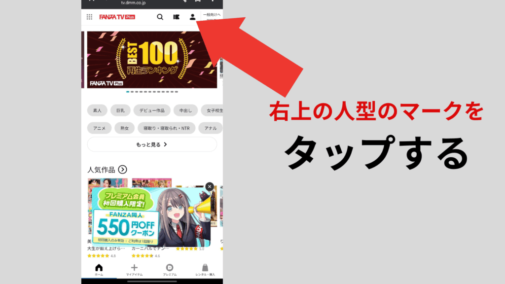 FANZAではなく、こちらからFANZA「TV」のWEBページにいき、右上の【人型マーク】からマイページへ行きます。