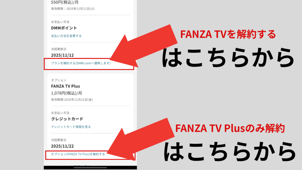 - FANZA TV Plusに登録している場合は、両方の解約が必要です。