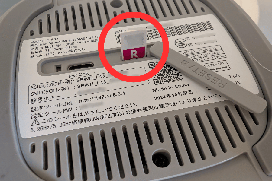 Speed Wi-Fi Home 5G L13のSIMの差込口は、底面のRESETを書いているカバーをあけたところにあります。